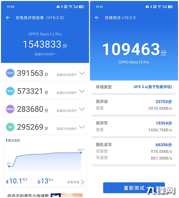 如上圖所示,OPPOReno12Pro安兔兔綜合成績達(dá)到了1543833分,符合天璣9200+的跑分表現(xiàn)。