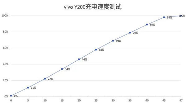 實際測試:5分鐘可以充至11%電量,10分鐘22%,15分鐘34%,30分鐘60%,顯示100%充滿電需要47分鐘,對于一款擁有6000mAh超大電池的機型,vivo Y200的充電表現(xiàn)足夠可以了。