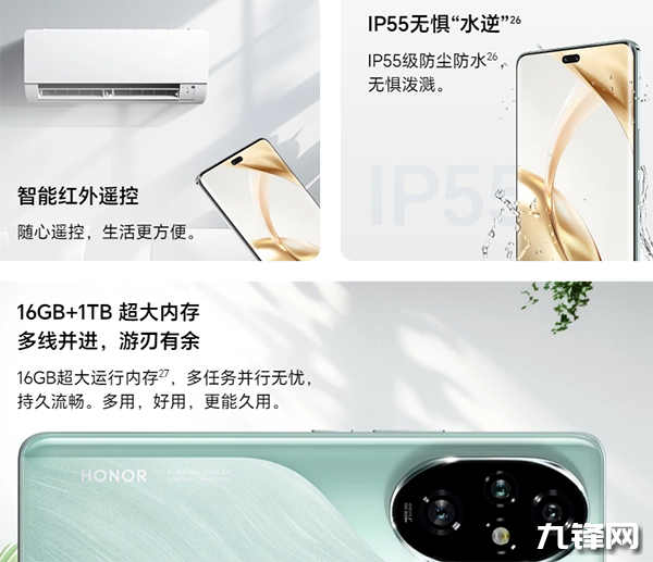 在核心功能上, 它配置了驍龍8sGen3處理器,榮耀自研射頻增強芯片C1+,5564mm2廣域不銹鋼仿生VC散熱,立體聲雙揚聲器,線性馬達(dá),IP55防塵防水,NFC,紅外遙控。