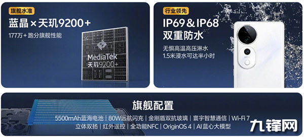 細節(jié)方面,它還支持藍牙5.3、Wi-Fi7、NFC、紅外遙控,支持IP68/IP69防塵防水,搭載基于Android14的OriginOS4系統(tǒng),支持AI藍心大模型。