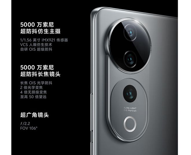 vivo S19 Pro采用后置三攝組合,它的主攝和2X長焦鏡頭均為5000萬像素,另外還有一枚800萬像素的超廣角鏡頭,而在前置方面,手機(jī)則配備5000萬像素JN1型號(hào)的超廣角鏡頭。