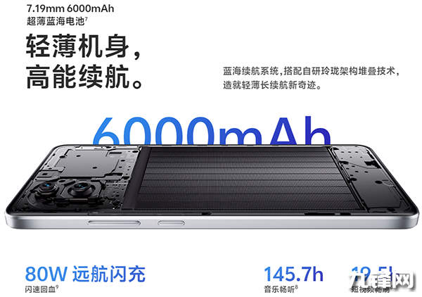 vivo S19在7.19mm機身內置入了一顆6000mAh藍海電池,其擁有809Wh/L行業(yè)超高能量密度,相同體積,容量更大;更支持連續(xù)聽音樂145h、-20℃無懼嚴寒超強續(xù)航等等,達成輕薄長續(xù)航。