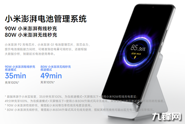 在充電方面,最高支持90W有線快充,80W無線快充,另外它還搭載了小米澎湃P2充電芯片和小米澎湃G1電池管理芯片,可提升手機(jī)續(xù)航能力同時(shí)延長(zhǎng)手機(jī)壽命,經(jīng)過1600次循環(huán)測(cè)試后電池容量≥80%。