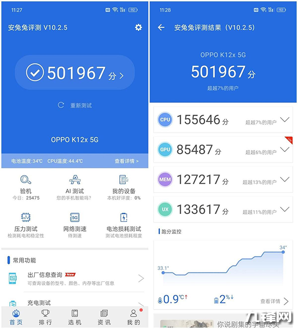 跑分方面,OPPO K12x拿到了501967分的總成績(jī),CPU得分155646,GPU得分85487,MEM得分127217,UX得分133617分,且經(jīng)過(guò)幾輪測(cè)試跑分差距都極小,可以看出它的性能輸出比較穩(wěn)定。