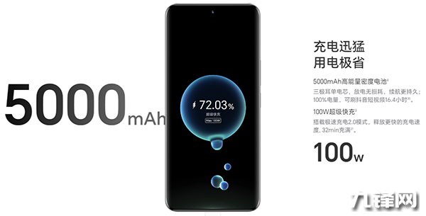 電池方面,它搭載了一個5000mAh的大容量電池,以及100W的超級快充,15分鐘即可充進一半電量,32分鐘即可完全充滿,亮屏?xí)r間能達到10小時以上,在正常使用的情況下基本上可以做到 1.5-2 天一充。