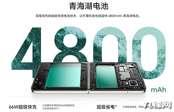 66W,榮耀Magic V Flip搭載了4800mAh青海湖高密度電池+66W有線快充,這個充電功率并大,在折疊屏手機中也算是中規(guī)中矩的水平。