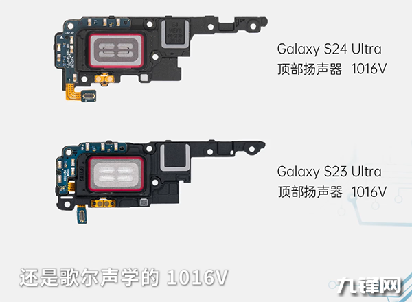 在音效方面,三星Galaxy S24 Ultra配置的是雙揚(yáng)聲器,它的頂部揚(yáng)聲器型號是歌兒聲學(xué)的1016V, 底部揚(yáng)聲器是多家供應(yīng)商提供的1014C。