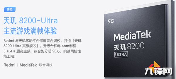 性能方面,搭載天璣8200-Ultra芯片,該芯片由Redmi與天璣移動(dòng)平臺(tái)深度聯(lián)合調(diào)校,采用臺(tái)積電4nm制程,3.1GHz主頻,同時(shí),輔以LPDDR5內(nèi)存+UFS3.1閃存。