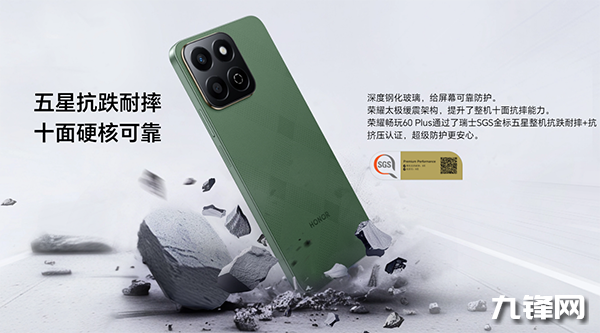 榮耀暢玩60 Plus不僅具備IP64級防塵防水等功能,還擁有五星超耐摔的優(yōu)點。