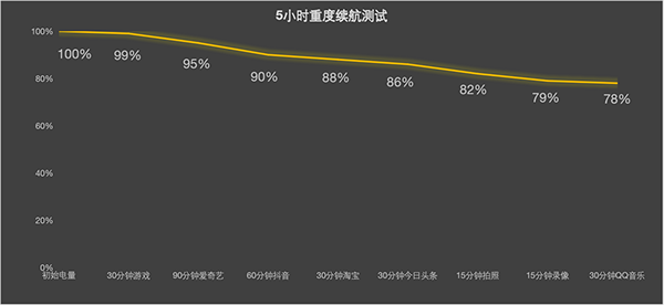 在線的5小時(shí)重度續(xù)航模式的測試,包括30分鐘《狂野飆車》游戲、90分鐘愛奇藝720P電影播放、60分鐘抖音短視頻瀏覽、30分鐘淘寶信息流瀏覽、30分鐘今日頭條信息流瀏覽、15分鐘拍照+15分鐘錄像(1080P,30幀)以及30分鐘QQ音樂播放,完整覆蓋大多數(shù)常見用機(jī)場景。