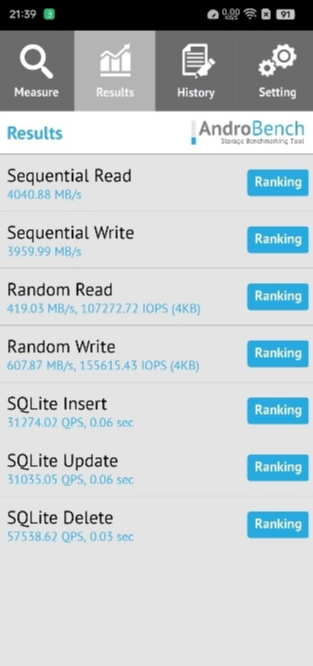 另外,也測(cè)試了閃存部分,順序讀取速度達(dá)到近4.0GB/s,順序?qū)懭胨俣冗_(dá)3.96GB/s,符合UFS4.0的水準(zhǔn),并且相比上一代快了接近18%。