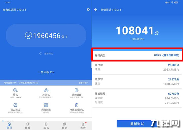 根據(jù)跑分成績顯示,一加平板Pro也為這款旗艦SoC搭配了品質很不錯的UFS3.1閃存,它的持續(xù)和隨機讀寫性能都達到了同級別中的領先水平。當然,沒用UFS4.0確實有點遺憾。