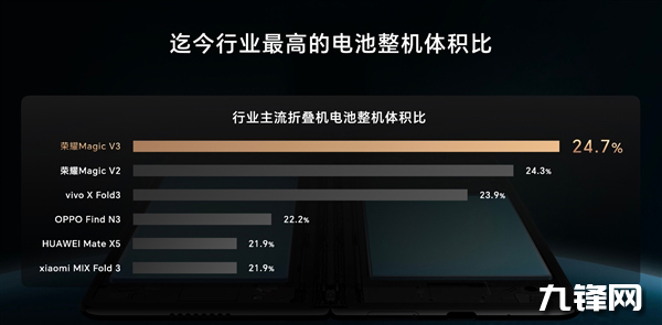 在電池配置上,這次的榮耀Magic V3首發(fā)搭載了第三代青海湖電池技術(shù),可以說,榮耀是行業(yè)首次將電池的硅含量突破10%,擁有行業(yè)最高24.7%的電池整機(jī)體積比,這使得新款電池相比Magic V2上的厚度減薄4.4%,能量密度提升5.74%,可以做到更輕薄。