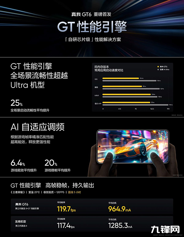 具體來看,這個GT性能引擎能深入芯片底層調(diào)度,打造超高能效性能體驗,與行業(yè)頂級旗艦機型相比,真我GT6全場景啟動流暢性平均提升25%。
