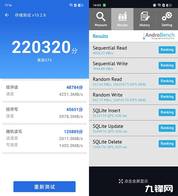 AndroBench中可達到連續(xù)讀取速度為4056.25MB/s,連續(xù)寫入速度為3946.88MB/s,以及隨機讀寫速度中讀取速度達到了415.46MB/s、寫入速度為642.75MB/s的成績。