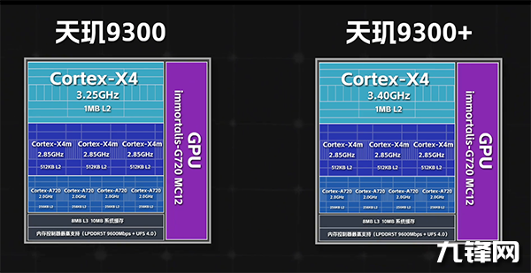 天璣9300+采用了臺積電4nm制程工藝打造,采用4+4的二叢集架構(gòu),包括了Cortex-X4超大核和四顆Cortex-A720大核。在Cortex-X4超大核當中有一顆頻率達到了3.4GHz,GPU部分,采用Immortalis-G720 MP12。