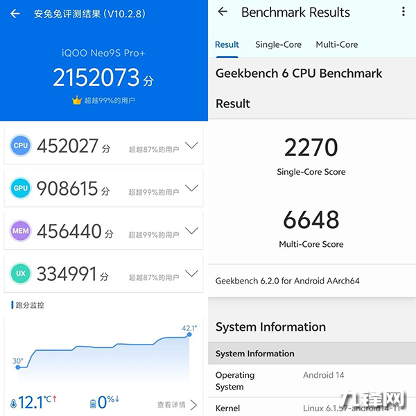 215萬(wàn)分,iQOO Neo9s Pro+搭載的是驍龍8Gen3處理器,安兔兔實(shí)測(cè)跑分在215萬(wàn)左右,GeekBench6跑分中,單核2270分,多核6648分,目前屬于是旗艦級(jí)別的性能水平。