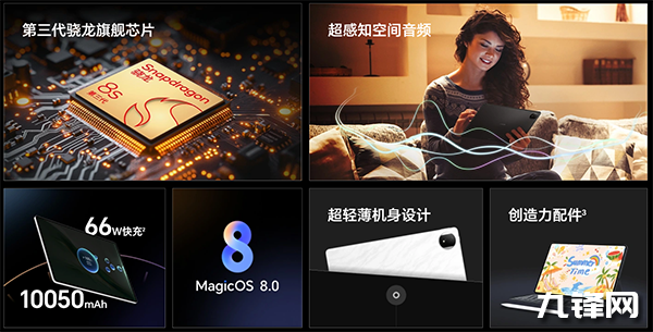 其它:三麥克風(fēng)、八揚(yáng)聲器,支持WiFi6、藍(lán)牙5.3,首發(fā)SGS五星抗彎折認(rèn)證,搭載MagicOS8.0.1系統(tǒng),支持MagicPencil3手寫筆。