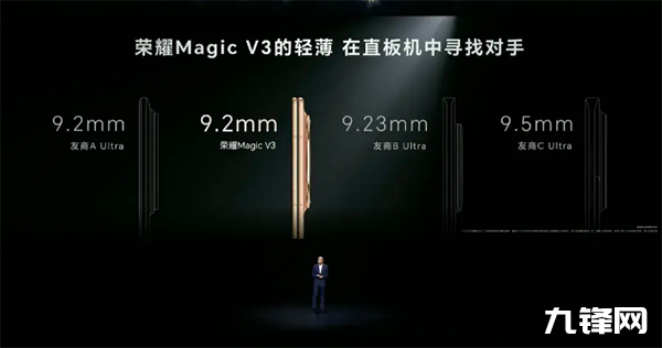 在外觀上,這次的榮耀Magic V3折疊后只有9.2mm,比上一代9.9mm的厚度又減少了0.7mm,刷新了折疊手機(jī)的厚度紀(jì)錄,這一厚度不僅遠(yuǎn)超市場(chǎng)上的其他競(jìng)爭(zhēng)對(duì)手,如三星和小米,成為目前市面上最薄的折疊手機(jī)之一。