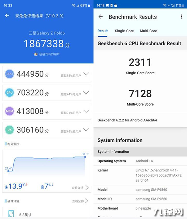 從跑分成績來看,短時(shí)間的GeekBench6測(cè)試中,三星Galaxy Z Fold6表現(xiàn)非常出色,單核得分2311分,多核得分7128分,表現(xiàn)是直板旗艦的水準(zhǔn)。