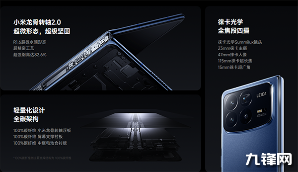 鉸鏈:龍骨轉(zhuǎn)軸2.0,轉(zhuǎn)軸零件數(shù)量137個(gè),超微水滴形態(tài)三級(jí)連桿設(shè)計(jì),82.57%超級(jí)鋼占比,全碳架構(gòu),50萬(wàn)次折疊壽命;