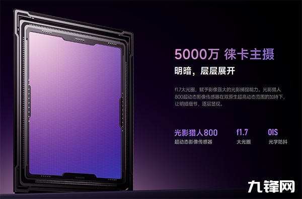 主攝像頭:5000萬像素,光影獵人800傳感器,1/1.55英寸、1G+6P,F(xiàn)1.7光圈,支持OIS光學防抖,等效焦距23mm,支持四合一2μm大像素輸出,PD對焦,1G+6P鍍膜