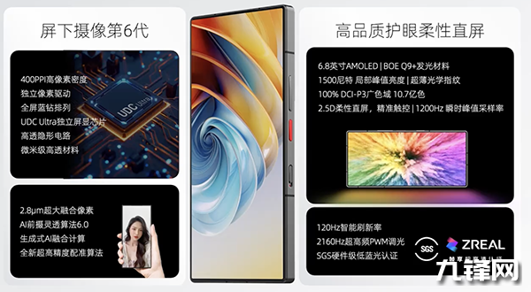 屏幕:尺寸是6.8英寸,分辨率是2480×1116(屬于1.5K級(jí)別),屏幕供應(yīng)商是京東方,Q9+發(fā)光材質(zhì)的OLED柔性直屏,UDC屏下攝像全面屏,支持120Hz刷新率、1200Hz瞬時(shí)觸控采樣率、2160Hz的PWM高頻調(diào)光,局部峰值亮度1500nit,400 PPI,10bit色深,100% DCI-P3色域;