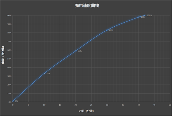 經(jīng)過實(shí)測,手機(jī)從1%開始滅屏充電,10分鐘電量充至33%,20分鐘電量已過半,達(dá)到59%,半小時電量充至83%,最終完全充滿用時42分鐘。