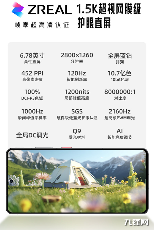該手機配備6.78英寸京東方OLED超視網(wǎng)膜級柔性護眼直屏,分辨率2800×1260,支持120Hz刷新率、1000Hz瞬時觸控采樣率、2160HzPWM高頻調(diào)光、10bit色深、100% DCI-P3色域,局部峰值亮度1200nits,支持全局DC調(diào)光,覆蓋龍犀玻璃。