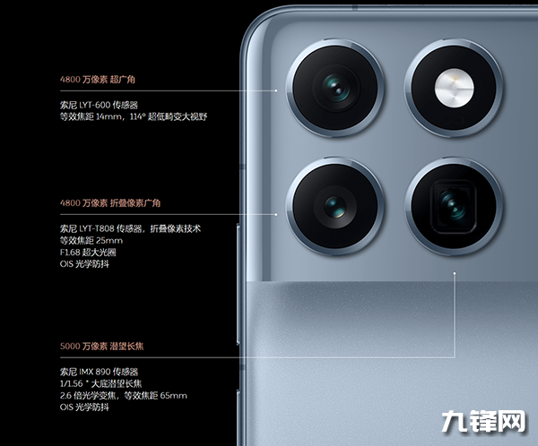 潛望長焦鏡頭:5000萬像素,索尼IMX890傳感器,1/1.56英寸,等效焦距65mm,F(xiàn)2.6光圈,OIS光學防抖,2.6倍光學變焦,1μm,舜宇模組,25cm微距對焦距離