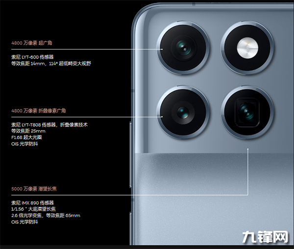 在焦距方面,它的主攝是25mm,超廣角是14mm,潛望長(zhǎng)焦是65mm,前置自拍是26mm。
