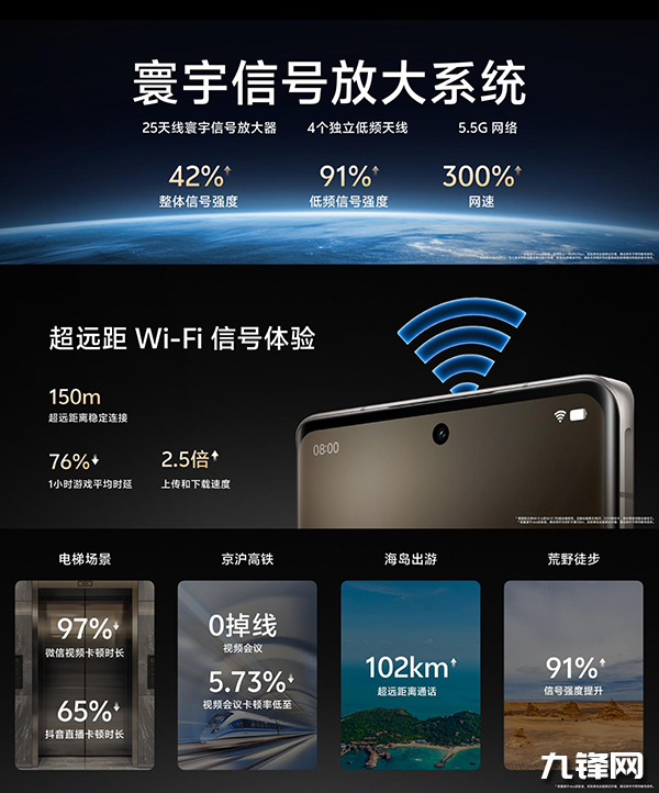 在信號方面,該機采用寰宇信號放大系統(tǒng),整體信號強度提升42%。低頻信號強度提升91%,同時支持網(wǎng)速3倍提升的5.5G網(wǎng)絡(luò),150m超遠Wi-Fi穩(wěn)定連接。