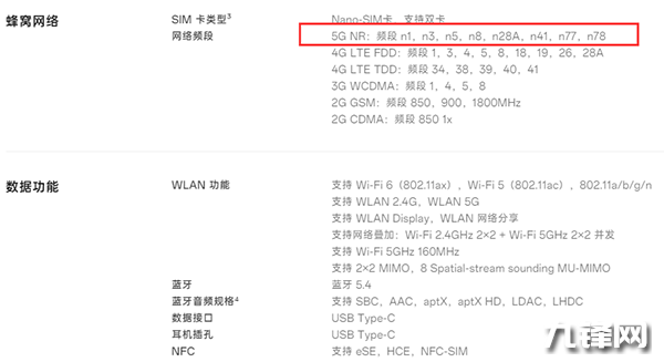 5G NR:頻段 n1,n3,n5,n8,n28A,n41,n77,n78。