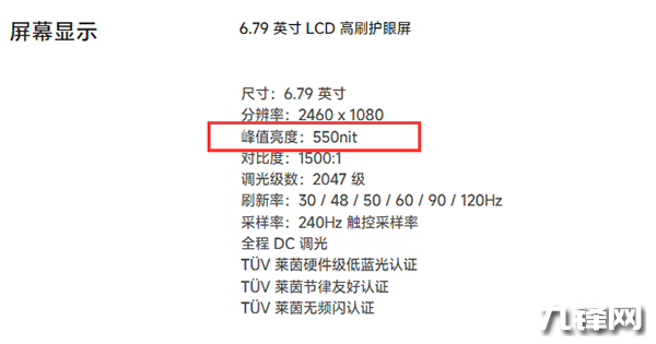 550nit,紅米Note13R配置的是6.79英寸LCD直屏,它的峰值亮度550nit。