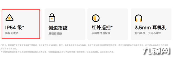 機身采用側邊指紋識別,保留了3.5毫米耳機孔和紅外遙控功能,支持IP54級別防塵防水功能。