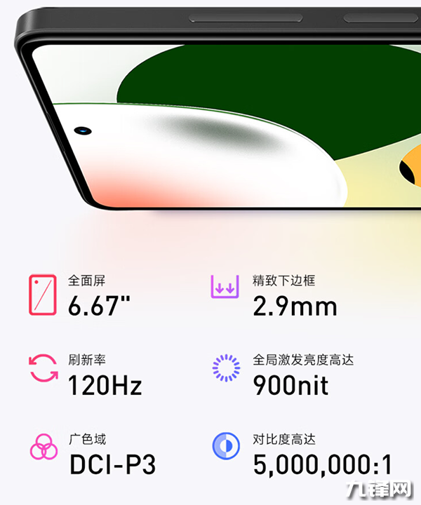 屏幕上搭載6.67英寸2400×1080分辨率的OLED柔性直屏,支持120Hz刷新率,240Hz觸控采樣率,最高亮度900nit,支持1920Hz高頻PWM調(diào)光。