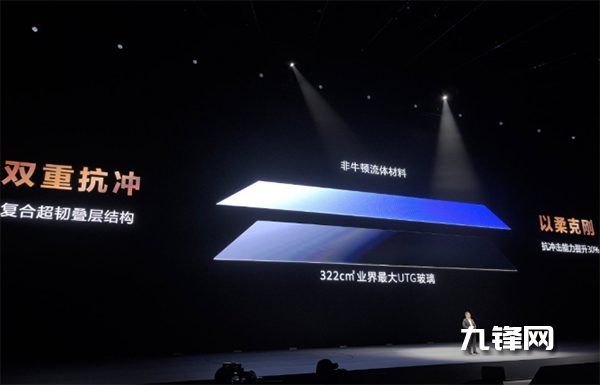 另外,它還使用了業(yè)界面積最大的UTG(超薄柔性玻璃),最外層為非牛頓流體材料,面積達332cm2,不使得整機更加輕薄,還增強了屏幕的抗沖擊能力,華為稱抗沖擊能力提升了30%。