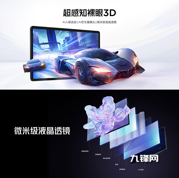 這款紅魔平板3D探索版搭載了一塊支持“超感知裸眼3D”的顯示屏,其采用了微米級液晶透鏡,依靠雙目視差原理,在人眼之中呈現(xiàn)3D畫面。