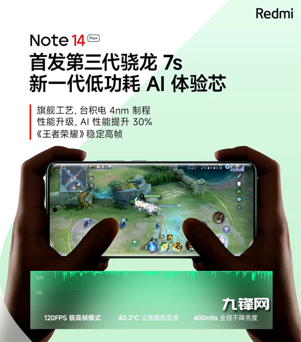 在核心性能上,這個紅米Note14 Pro+首發(fā)搭載了驍龍7s Gen3處理器,AI性能提升30%,《王者榮耀》120fps模式穩(wěn)幀輸出,400nit不降亮度,正面最高溫度40.2。