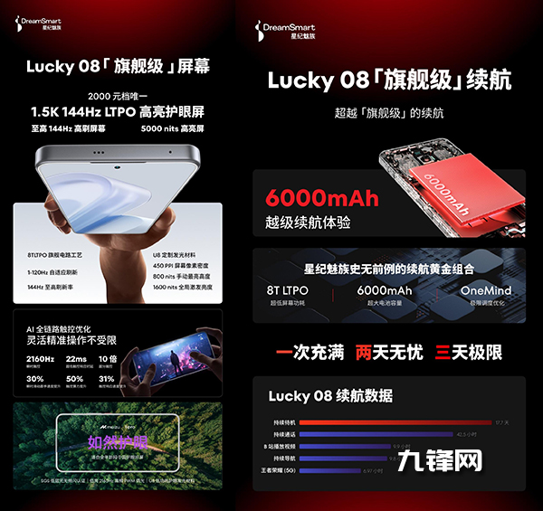 而這次魅族Lucky 08也用上了6000mAh的大電池,配合上8T LTPO超低屏幕功耗和OneMind的調(diào)度優(yōu)化,能做到持續(xù)待機17.7天,連續(xù)播放視頻能使用9.9小時,5G環(huán)境下玩王者榮耀續(xù)航也能達到6.97小時,擁有超越旗艦級手機的續(xù)航表現(xiàn)。