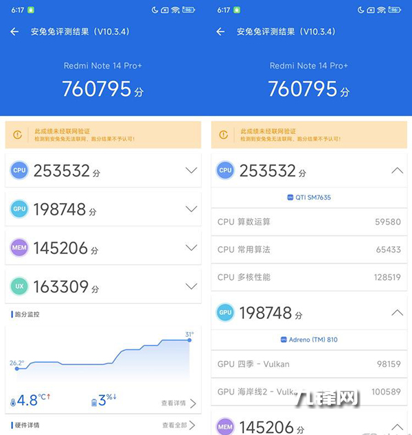 我們手頭這臺(tái)16GB+512GB存儲(chǔ)組合版本的Redmi Note14 Pro+,在安兔兔評(píng)測(cè)中取得了760795分的綜合成績,比第二代驍龍7s的常見表現(xiàn)基本要高出差不多20%的水準(zhǔn)。