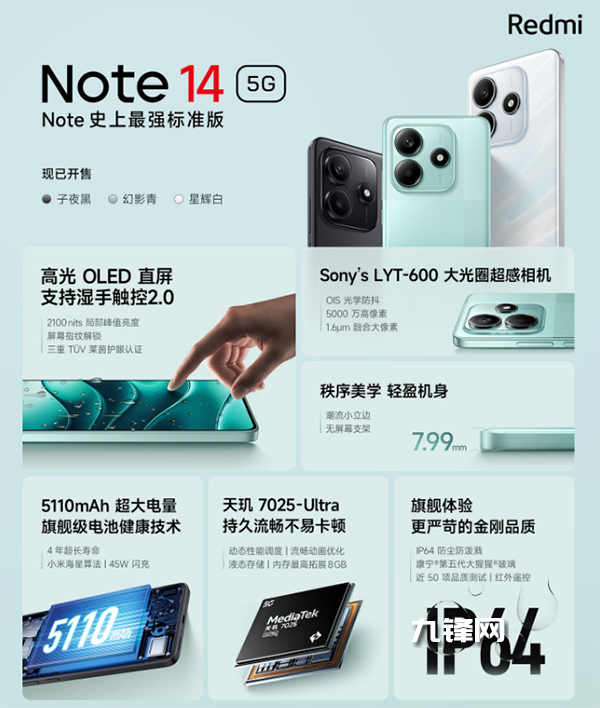 紅米Note14提供子夜黑、星輝白、幻影青三色可選,整機(jī)厚度僅有7.99mm,重量控制在190g,整體的重量上控制的還是可以的。