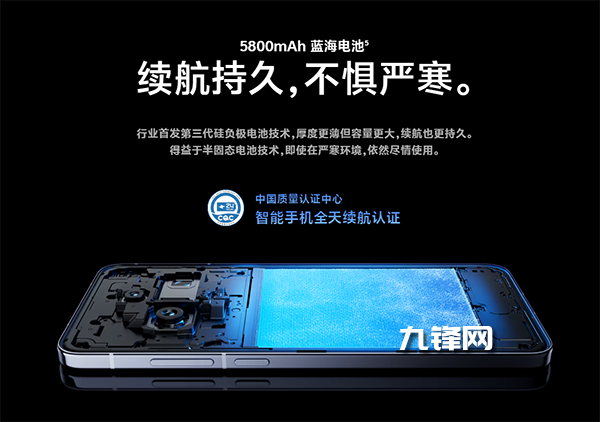 該機將5800mAh的超大容量電池塞進了僅有7.99mm厚的機身中,借助834Wh/L的能量密度,一躍成為了vivo有史以來電池最大的標準版旗艦手機。