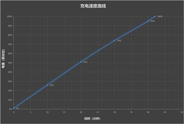 在充電測(cè)試前,我們開啟超快充電模式,從1%開始測(cè)試充電速度,10分鐘充電26%,20分鐘充電51%,30分鐘充電74%,40分鐘電量充至95%,最終完全充滿用時(shí)42分鐘。
