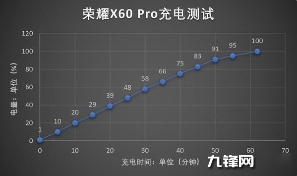 快充方面,榮耀X60 Pro這一次帶來了66W超級快充,從測試來看,10分鐘充電20%,30分鐘充電58%,充電至100%耗時62分鐘。