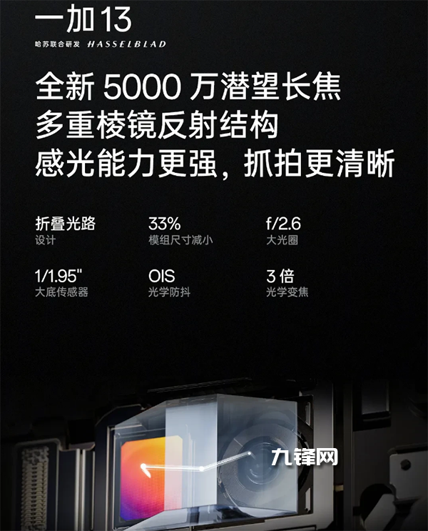是,一加13配置了一顆5000萬像素的新一代潛望式長焦鏡頭,并且是多重棱鏡反射結(jié)構(gòu)的潛望長焦。
