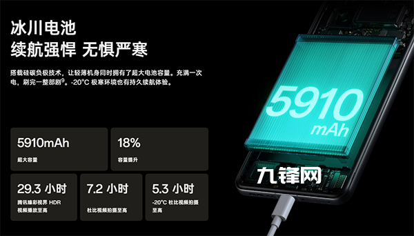 電池方面,該機搭載的是5910mAh的冰川電池,采用最新的硅碳負極電池技術(shù),具備830Wh/L的超高能量密度。