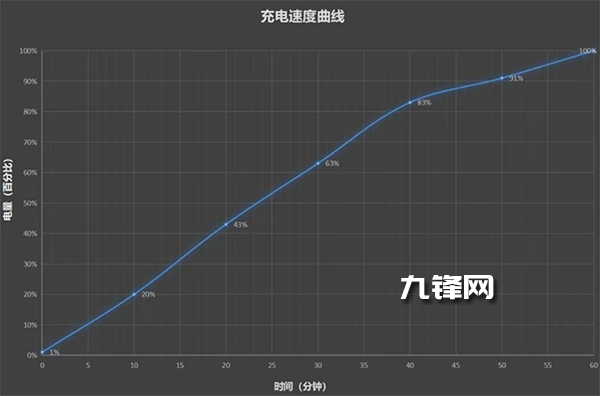 我們從1%開始進(jìn)行滅屏充電測(cè)試,10分鐘手機(jī)電量充至20%,20分鐘電量充至43%,半小時(shí)電量達(dá)到63%,40分鐘電量來到83%,最終完全充滿電用時(shí)整整60分鐘。