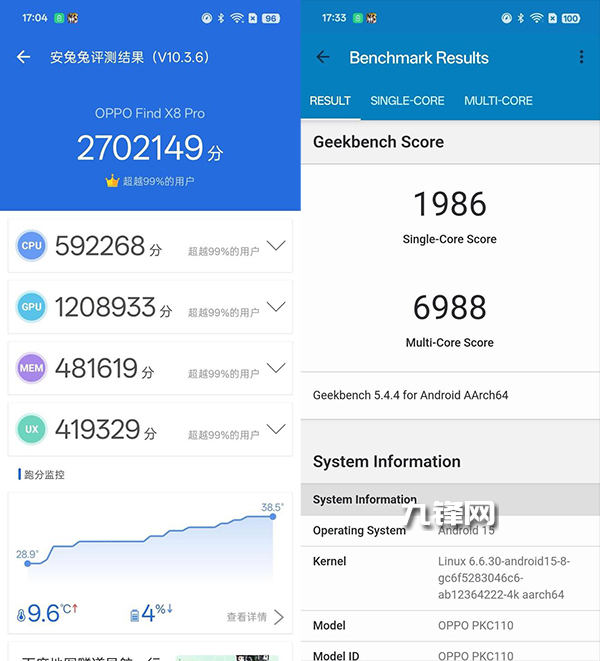 在Geekbench5中,OPPO Find X8 Pro單核跑分為1986分,多核跑分為6988分,多核的跑分會(huì)略低一點(diǎn)。