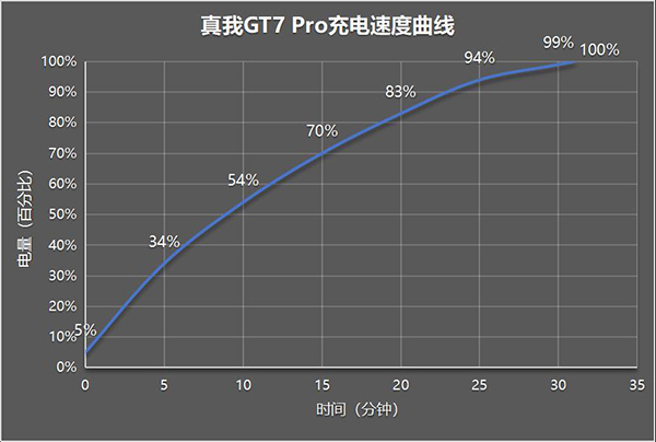 真我GT7 Pro開始充電10分鐘,電量就已經(jīng)來到了57%;之后功率逐步放緩,在15分鐘充電70%;25分鐘充電94%,最后于31分鐘徹底充滿。